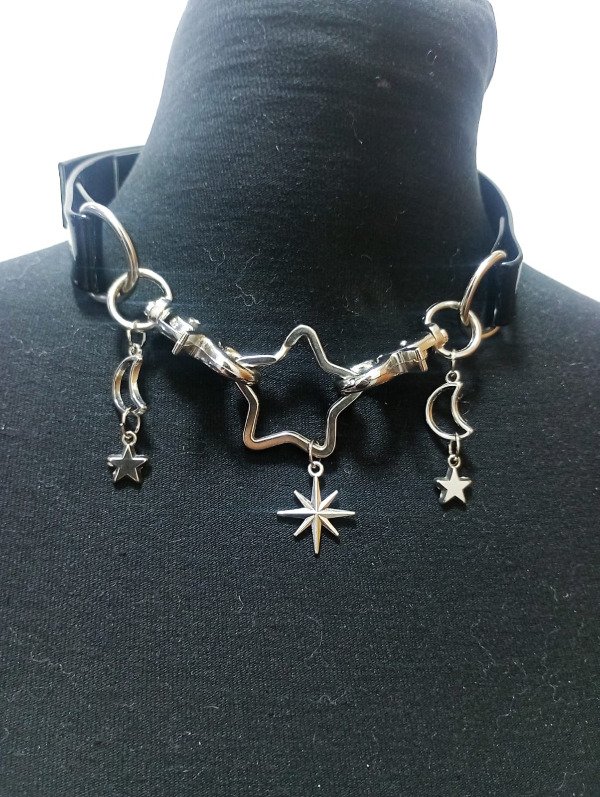 Choker de mosquetones y estrellas con dijes de lunas y estrellas.